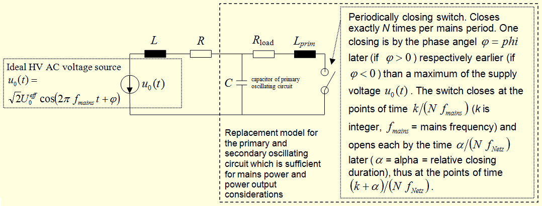 The mains frequency is denoted by f_mains. The synchronously rotating spark gap is assumed to fire exactly